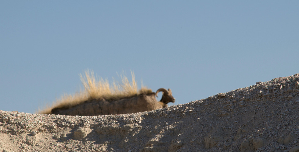 We continue to take the southeast direction of Badlands Loop Road. Of all the parks that we have visited, Badlands is on the top of the list for close wildlife encounters. Bighorn Sheep are plentiful here and make it known that we, the people are intruding on their property. You will see them everywhere. As we drive down the road, we pass one that is keeping up with the car. Or we are keeping up with it. I do my best to capture his stride. Finally, we out pace him.